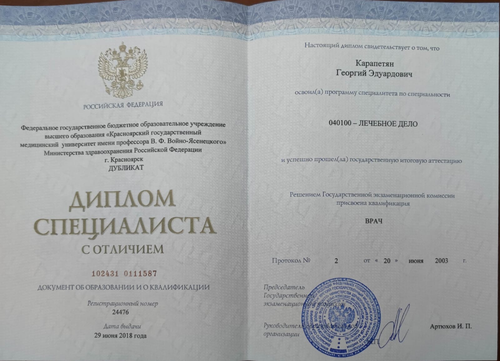 В 2003 году - с отличием окончил Красноярскую государственную медицинскую академию по специальности «Лечебное дело».