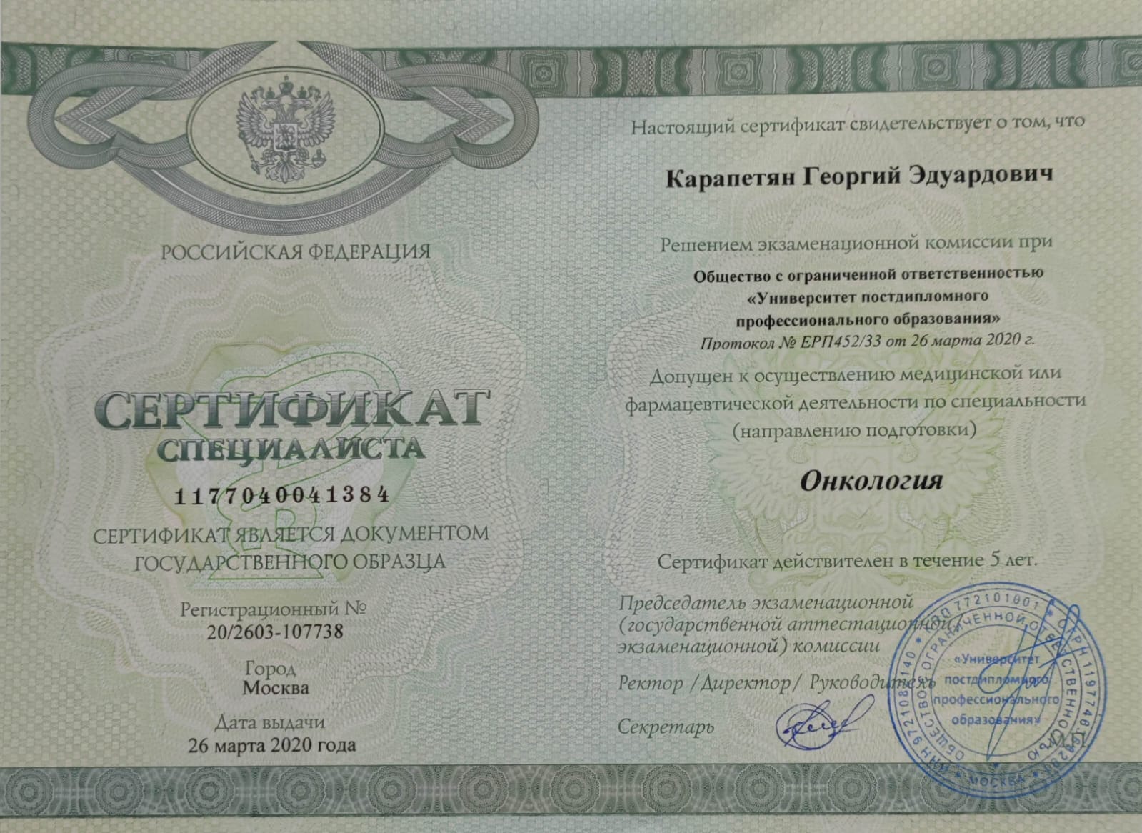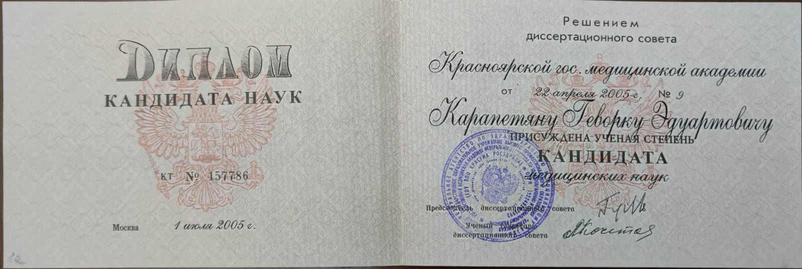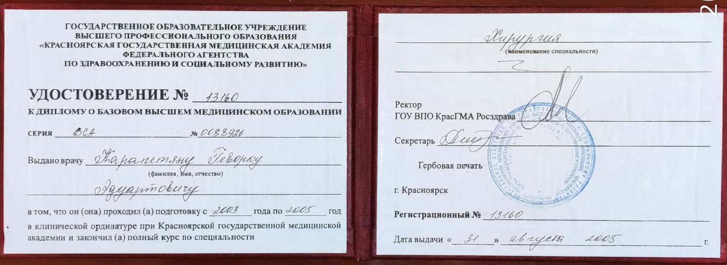 В 2005 году - окончил клиническую ординатуру на кафедре общей хирургии по специальности «Хирургия».